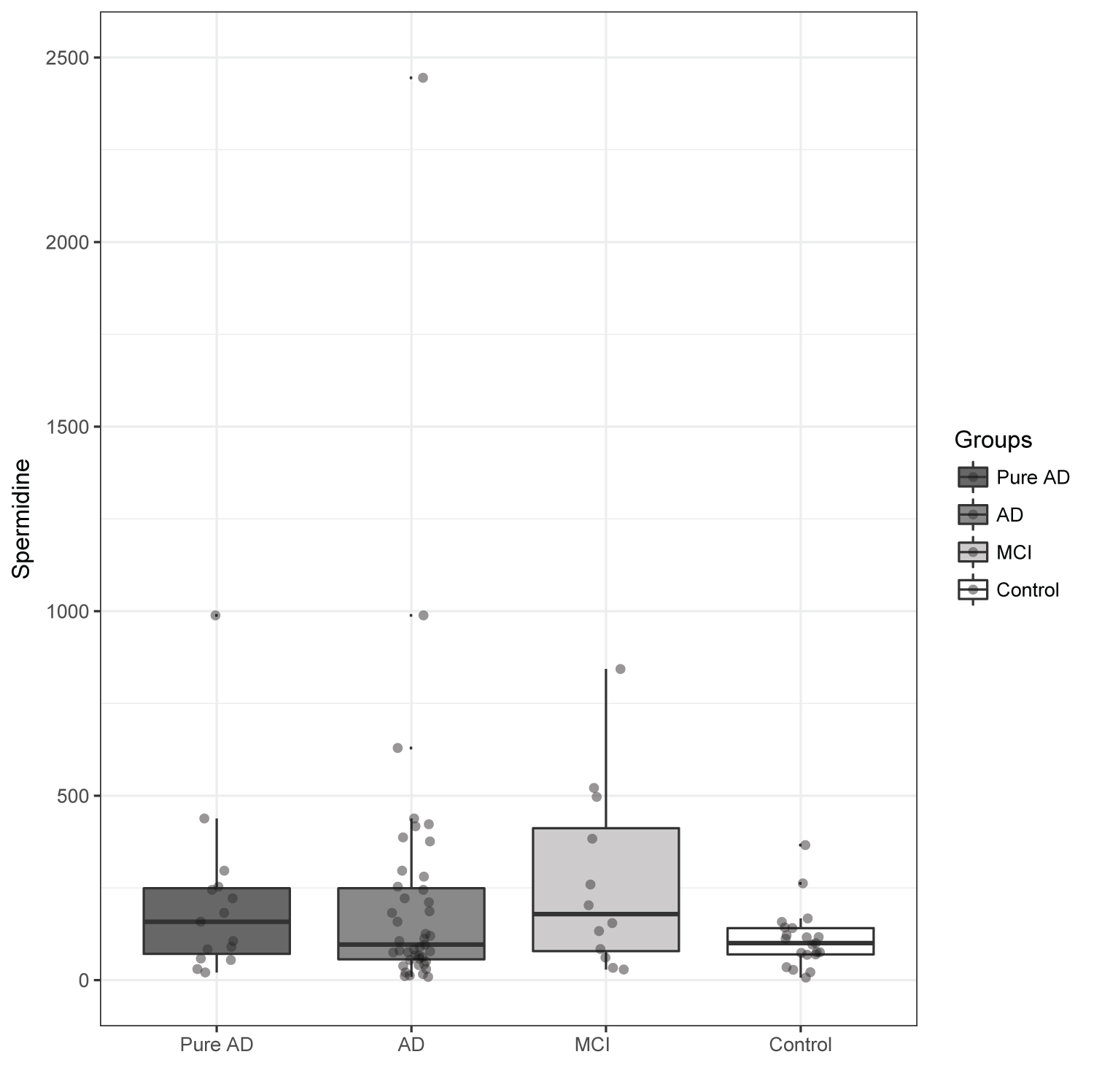 Table 2 and Figure 1 show data comparing Spermidine serum levels between AD participants, pure AD participants, MCI participants, and controls. The term "pure AD" refers to those subjects who present with brain pathology indicative of AD, without the presence of additional pathology related to other neurodegenerative diseases, the latter often termed "mixed dementia. The results of Spermidine in Participants with mixed dementia upon autopsy were analyzed as part of the total AD group. Table 2 shows the results as mean ± SD. Figure 1 shows both the mean and median in each group, adjusted for gender.