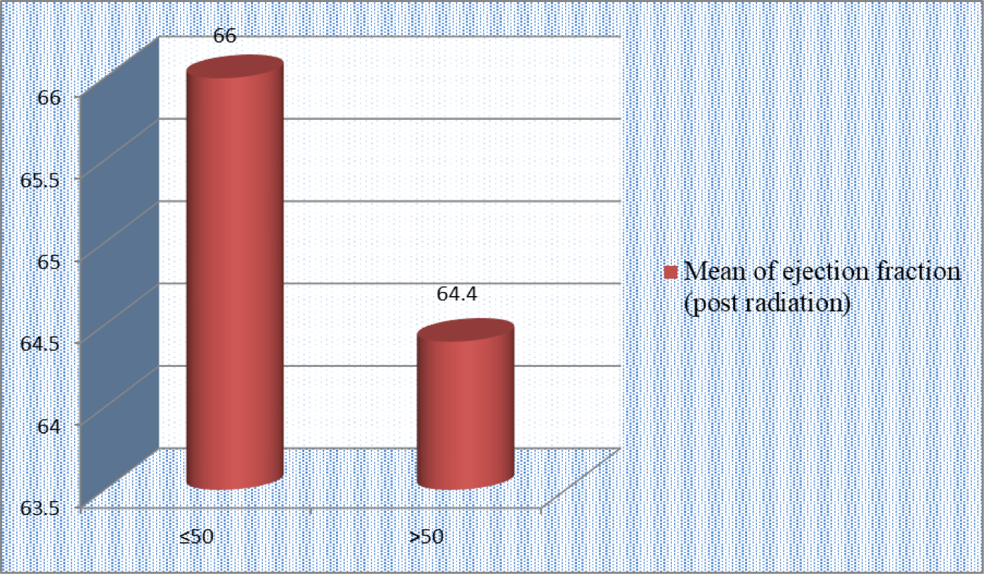 The results demonstrated there was no significant difference (p=0.2) in mean value of ejection fraction (post radiation) of patients who were irradiated by 4260 or 5000 Gy (Table 3).