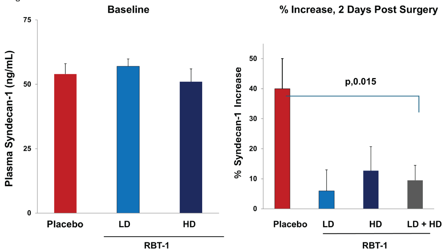 Methods: Patients (n, 112) were randomized to receive low-dose RBT-1, high-dose RBT-1, or placebo 24-48 hrs prior to surgery. Plasma samples were obtained before and 2 days post-surgery and assayed for SDC-1 (ELISA). The results were compared between the groups. To gain further insights, CD-1 mice were subjected to diverse forms of acute renal injuries (maleate, glycerol, endotoxemic AKI; acute heart failure). RBT-1’s impact on resulting plasma SDC-1 increases, vascular/aortic stress (NGAL/IL-6 gene induction), and the expression of two vascular cytoprotective pathways (Nrf2; ferritin) were assessed.