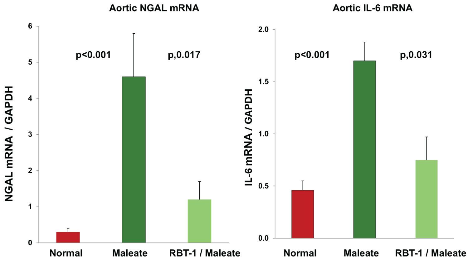 RBT-1 preconditioning protects the aorta from maleate-induced injury, as assessed by NGAL/IL-6 mRNAs: Maleate dramatically increased aortic NGAL mRNA and IL-6 mRNA at 18 hrs post injection, indicating aortic injury/stress (Figure 3). RBT-1 preconditioning significantly decreased the extent of these NGAL mRNA and IL-6 mRNA elevations, indicating a vasculature protective effect.