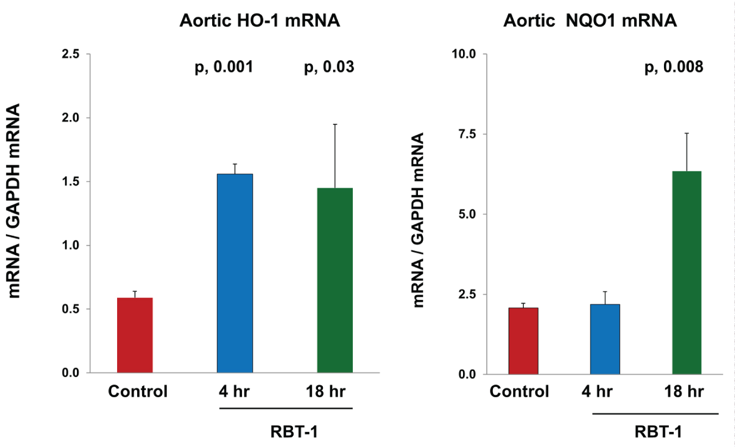 Nrf2: Within 4 hrs of RBT-1 infusion, a 3-fold HO-1 mRNA increase was observed and persisted for at least 18 hrs (p, 0.004) (Figure 4). A 3-fold NQO1 mRNA elevation was evident at the 18 hr (p, 0.018), but not at the 4 hr, time point. The latter is consistent with prior findings that NQO1 reacts more slowly to RBT-1 vs. other Nrf2 sensitive genes.