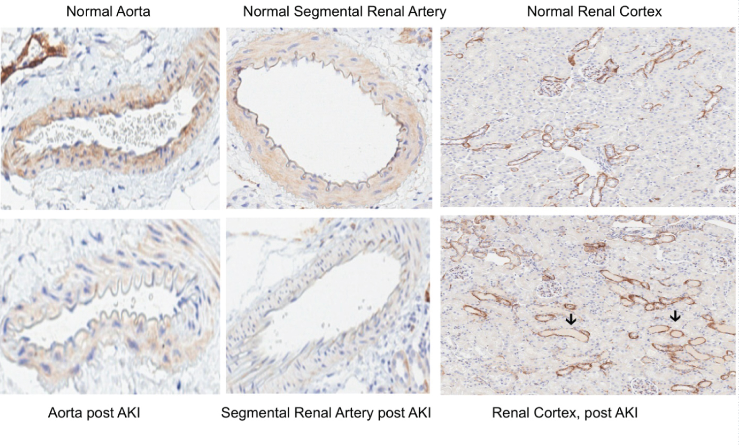 Post glycerol-induced AKI, marked decreases in aortic and renal vascular SDC-1 staining were observed, compared to normal samples (Figure 6). In contrast, no observable difference in renal tubular SDC-1 staining was observed between the normal and post AKI renal tissues. The loss of vascular SDC-1 post glycerol AKI corresponded with an approximate 4-fold increase in SDC-1 plasma concentrations (glycerol, 5.1 ± 0.2 vs. 1.6 ± 0.2; p < 0.05).