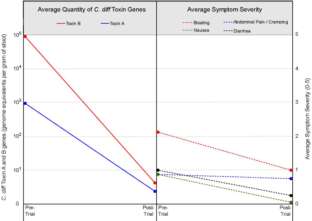 Symptom assessment focused on four key indicators: diarrhea, bloating, abdominal pain/cramping, and nausea. None of the participants reported a fever throughout the duration of the trial. Five of the eight participants did not report experiencing diarrhea pre-trial, potentially indicating toxigenic C. diff colonization without active infection or mild or atypical clinical presentations. Not all symptoms were present in every participant, with bloating being the most prevalent and severe. Across all participants, symptom severity scores decreased following the intervention period, suggesting overall symptomatic improvement.