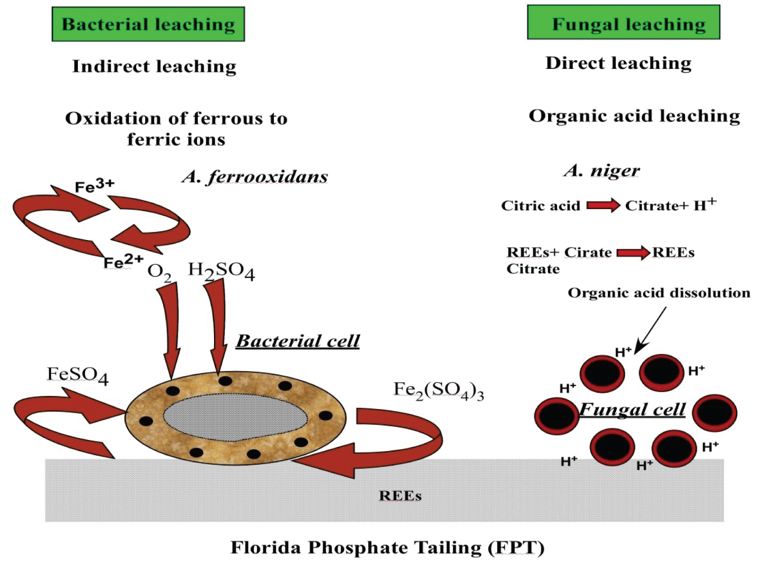 In this context, [33] investigated the role of Aspergillus ficuum and Pseudomonas aeruginosa exhibit good potential in generating varieties of organic acids effective for bioleaching some rare earth elements (REEs) from Egyptian monazite (purity 97%) and (thorium-uranium) concentrate. [34] mentioned that the bacterial Acidothiobacillus ferrooxidans (Af) and the fungal Aspergillus niger (An) for bio-leaching of REEs from a phosphate ore. Figure 1 appeared the scheme visualizing the mechanism of indirect, direct bio-leaching of A. ferrooxidans and A. niger for REEs from Florida phosphate tailings.