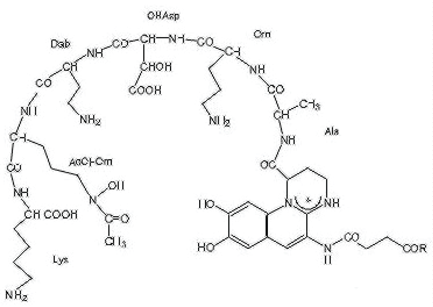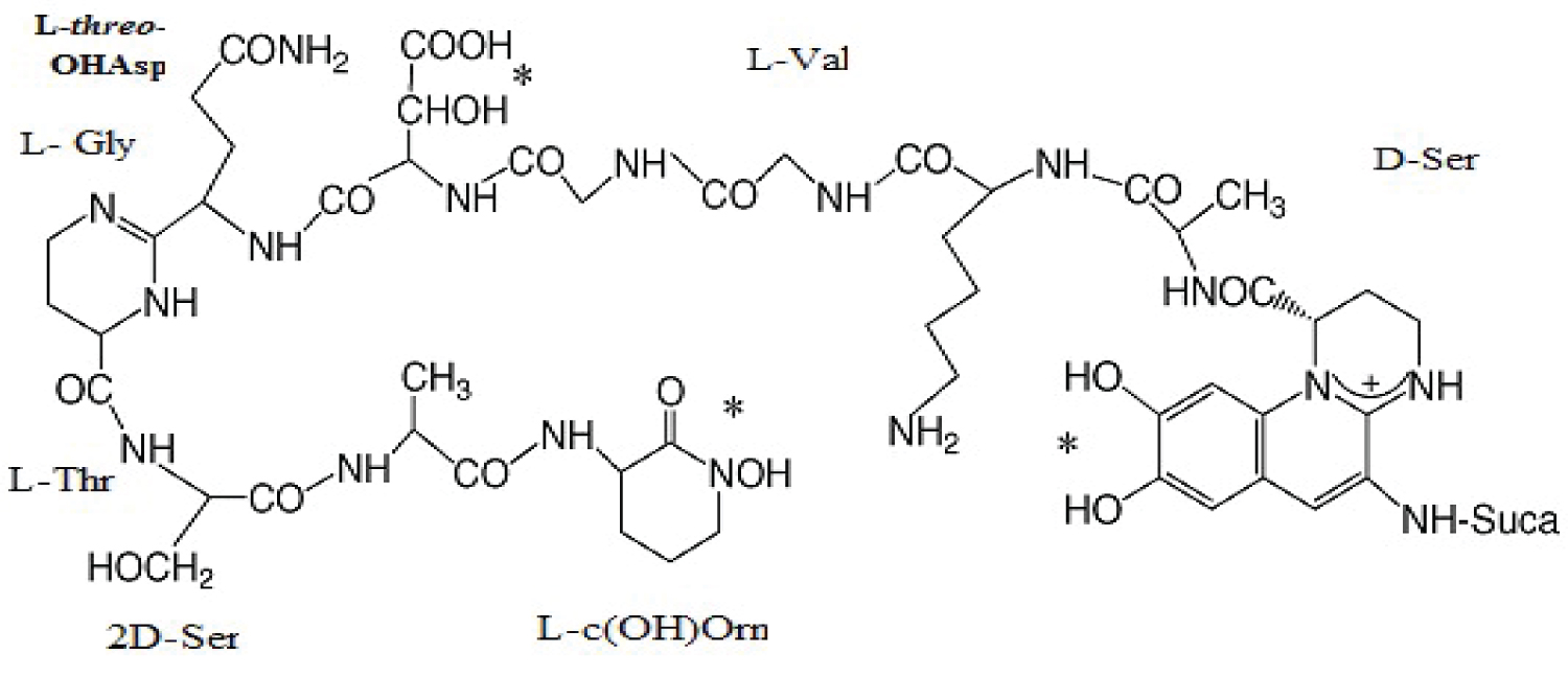 Siderophores are relatively low-molecular-mass (< 14 kDa). Siderophores are divided into classes based on their functional groups or on such special characteristics as pigmentation. Those having hydroxamic acid as their functional group constitute the hydroxamate class, while those using catechol to chelate Fe 3+ are called catecholates or catechol amides. Pyoverdine class siderophores have different chelation moieties, including hydroxamic acid, catechol and carboxyl group in the same molecule. Several authors have suggested that some bacteria produce different siderophores with varying affinity for Fe 3+ and other transition metals in order to supply the dells with essential trace elements [37,38]. Pyoverdine consist of three distinct structural parts, viz. a dihydroxyquinoline chromophore responsible for their fluorescence, a peptide chain comprising 6 to 12 amino acids bound to the chromophore carboxyl group and a small acid (or its monoamide) connected amidically to its NH 2 group. The peptide chain has a twofold function. It provides two of the ligand sites for Fe 3+ and it is for the recognition of the ferri-pyoverdine by specific receptors located at the surface of the producing cell [36]. [39] investigated that Pseudomonas aeruginosa SHA 282 was identified by 16S rDNA sequencing. It was found to produce catechol and hydroxamate derivates of pyoverdine. The gel electrophoresis of pyoverdine appeared that it contained two protein bands at ~12.5 and 9.5 kDa. The gene responsible for pyoverdine production was identified. This compound was able to complex and chel at with 87.43% and 90.16% of thorium (IV) from monazite and (Th-U) concentrate, respectively. The proposed structure of pyoverdine produced by Pseudomonas aeruginosa SHA 282 in Figure 2.