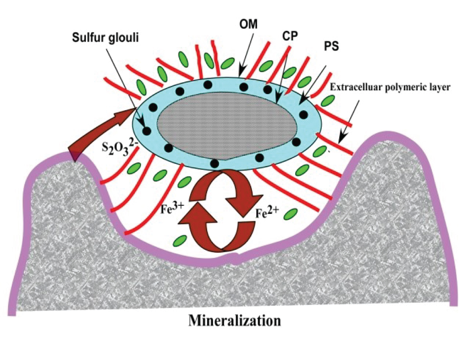 Bioleaching microbes have number of features in common that make their role especially suitable for mineral solubilization. The most important microbes involved in the bio oxidation of minerals are those responsible for producing ferric ion (Eq. 4) and sulphuric acid (Eq. 5) required for the bioleaching reactions. Ferric sulphate, a powerful oxidizing agent, oxidizes the copper sulphide minerals leading to the in situ leaching of copper by the sulphuric acid generated therein.
