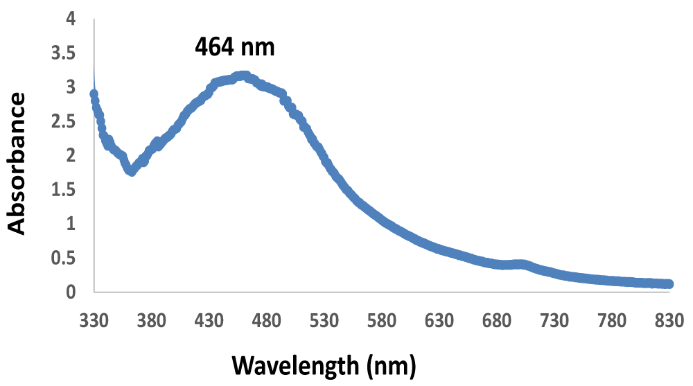The formation of the synthesized silver nanoparticle was achieved through UV-visible spectrum analysis, revealing a prominent absorbance peak at 464 nm, as illustrated in figure 2. This finding aligns with the results reported by Gabriela and his group, who also observed a characteristic absorption band for silver nanoparticles ranged from 438-470 nm [12]. The occurrence of this peak is attributed to the specific surface plasmon resonance (SPR) excitation of the silver nanoparticles, as explained by Das and his colleagues [13]. However, the extended wavelength could also be indicative of the formation of silver nanowires of Mentha piperita leaves aqueous extract.