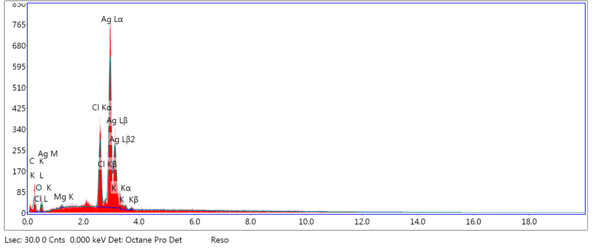 The EDX analysis exhibited a robust signal in the silver region, providing confirmation of the presence of silver nanoparticles, as depicted in figure 4. The optical absorption peak was noted at 3 keV, a characteristic absorption value for metallic silver nanoparticles attributed to surface plasmon resonance [16]. Furthermore, additional peaks corresponding to Cl, O, Mg, K and C, were observed. These peaks may be attributed to the biomolecules or chemical components present in the Mentha piperita leaf extract that are commonly associated with the surface of the AgNPs [17].