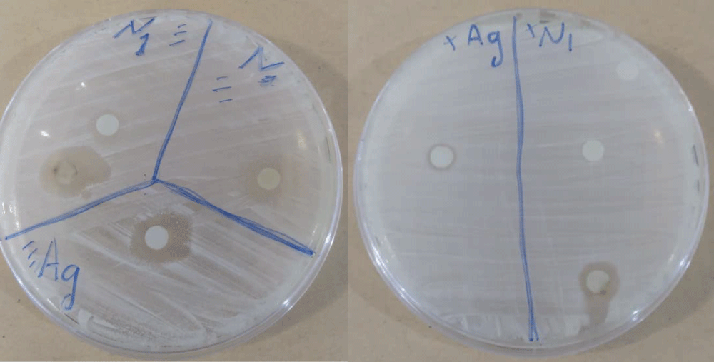 The study investigated the antibacterial properties of silver nanoparticles synthesized from Mentha piperita leaf extract. The synthesised silver nanoparticles were tested for their antibacterial efficacy against two types of bacteria: E. coli (Gram-negative) and Streptococcus aureus (Gram-positive) using the disc diffusion method for antibacterial susceptibility testing [22]. A comparison was made between the AgNPs from Mentha piperita leaf extract (N1) and AgNO3 (Ag) as depicted in figure 6.