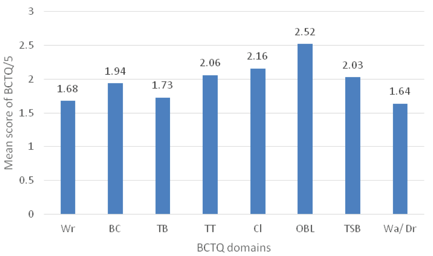 We conducted a transversal, descriptive and analytic study at two phases (15 th August-15 th november 2022; 01 January - 3 August 23; at the Departments of Neurophysiology and Physical Medicine, Fann teaching hospital, Malt Orthopedia Department, Dakar, Senegal. Study included patients followed at those centers, for treatment of unilateral CTS. Diagnosis of CTS were clinical and or ENMG. Clinicals symptoms retained were Pain and paresthesia in three first fingers, associated of tinel and or Phalen signs. ENMG aspects were reduced trans-carpal velocity more than 10 m/second, in comparison of velocity at forearm and high motor distal latency in median nerve (superior of 4 ms). Patients with bilateral CTS and those with pre-existing functional limitations of upper limb were excluded. We establish a questionary for noted sociodemographics aspects, clinical and results of ENMG aspects. We class patients in 3 groups of severity according to trans-carpal tunnel velocity (Table 1). We used Functional domains of Boston Carpal Tunel Questionary (FBCTQ) for evaluation of functional limitations of CTS. This questionnaire evaluated 8 domains of activities of hand. Domains of BCTQ are write (Wr), buttoning clothes (BC), taking a book (TB), taking a telephone (TT), cleaning (Cl), opening a bottle lid (OBL), taking shopping bags (TSB), washing (Wa) and dressing (Dr). Patients who cannot write or do not use affected side to write are evaluated on the remaining items. Items are answered on a 5-point scale ranging from 1 (no difficulty) to 5 (cannot perform activity at all). A single score is calculated as the average of the FCTQ in 69 by adding scores of different items of questionary divided by 8 (or 7 in patients who cannot write). The averages were represented by classes: [1; 2]/[2;3]/[3;5]. Assessment of pain was done by Neuropathic Pain Scale. Hook grip strength was measured in all patients by a dynamometer with a maximum strength of 90 kg (Figure 1), twice in pathologic side, one in normal side. Our choice for evaluation of hook grip strength supported by necessary contraction of superficial flexor carpi digitis and muscles of thenar eminency, innerved by median nerve. We retained best strength on pathologic side. Grip strength of pathologic side, compared to normal side and we retained difference of strength and classed patients in three groups of severity (Table 2). Data collection and analysis were carried out with strict respect of identity and informed consent.