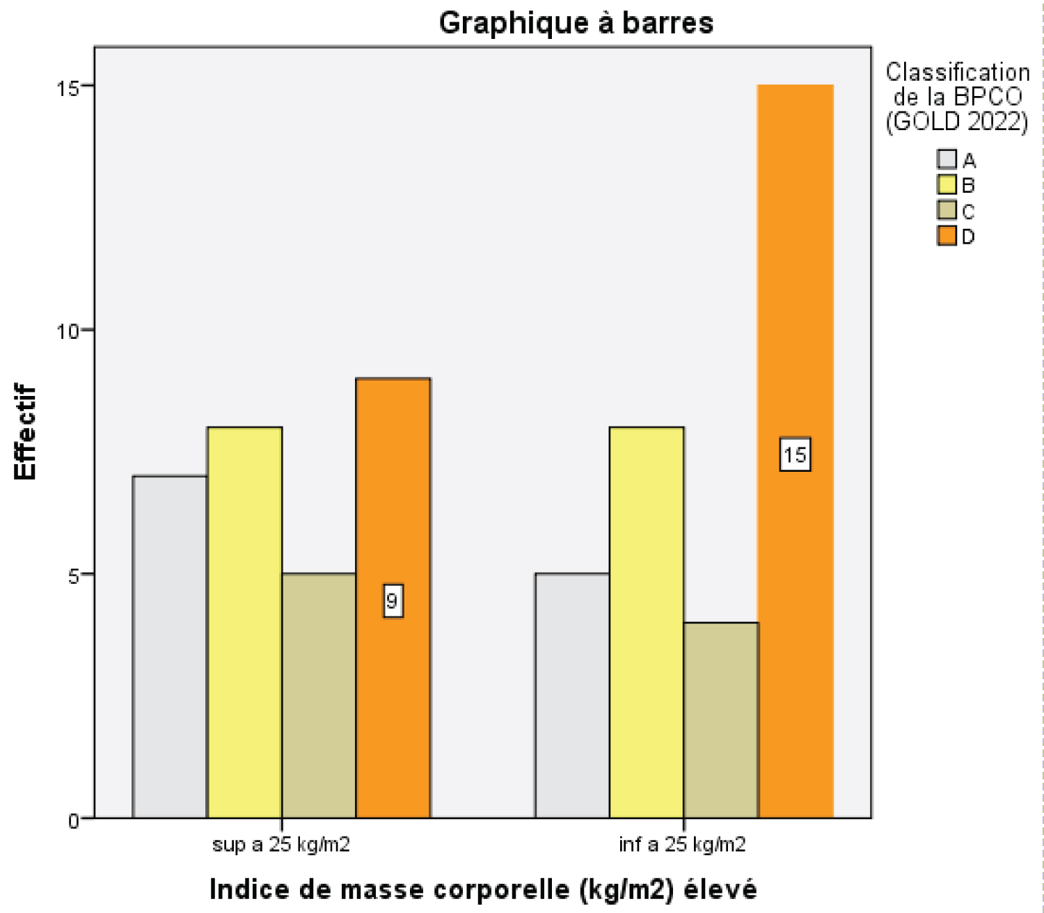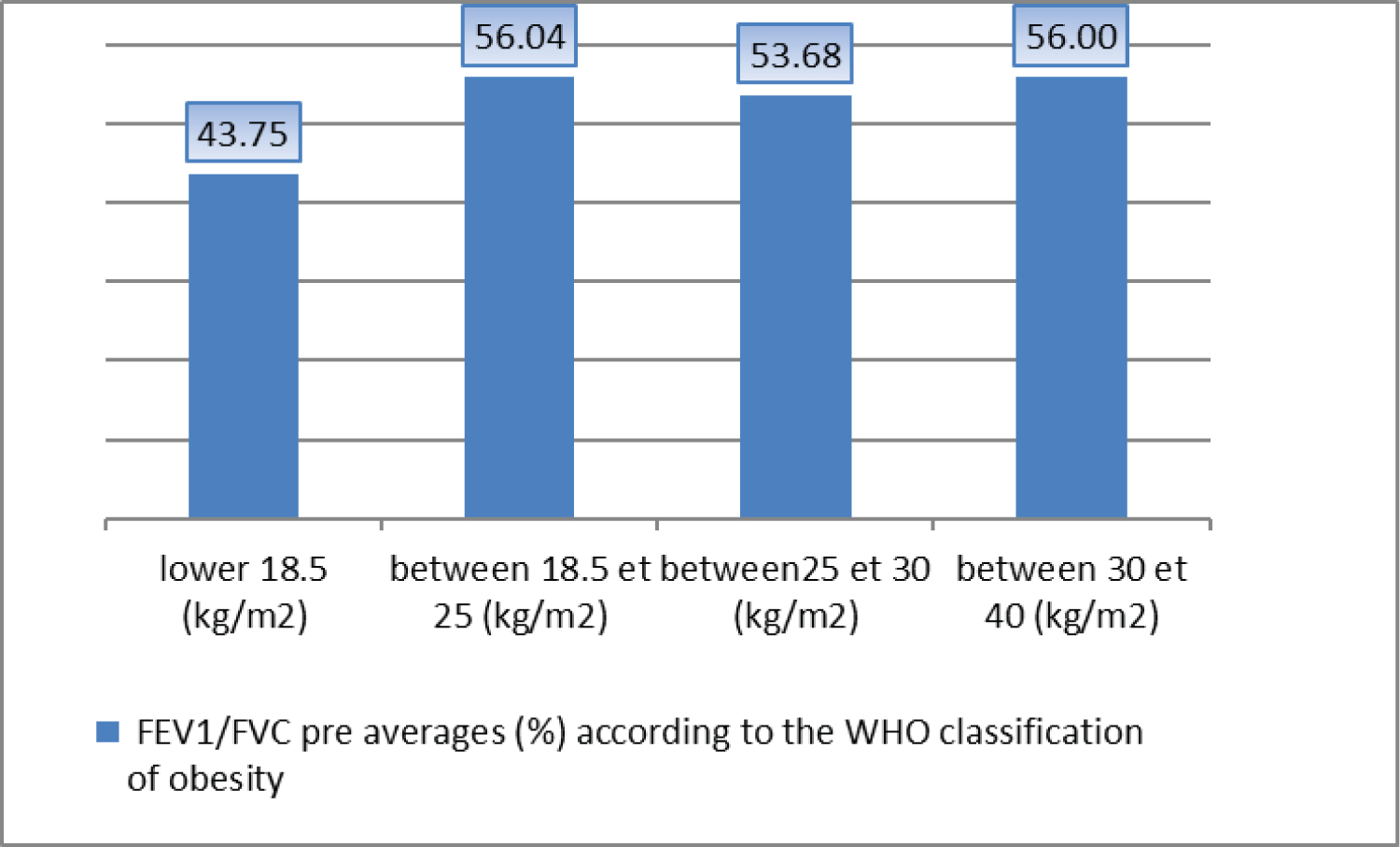 Conclusions: Contrary to expectations, obesity is not necessarily associated with adverse effects during COPD. As our results show, The data from our work are consistent with those of the literature showing that overweight and obesity in patients followed for COPD are associated with better tolerance to effort and has less severe airway obstruction.