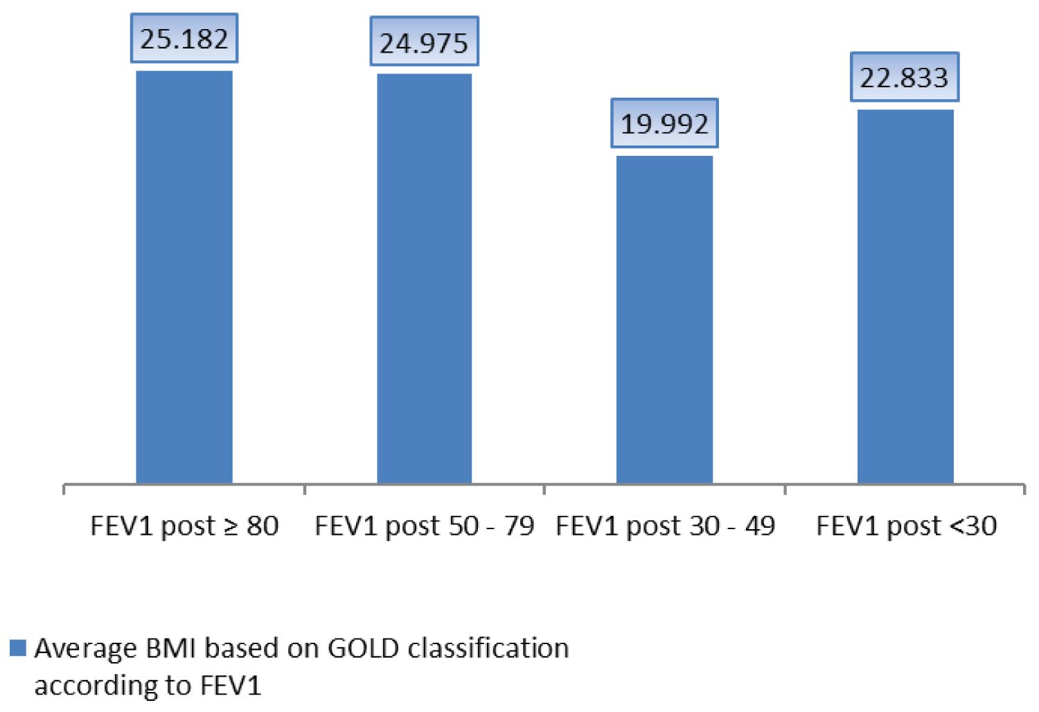 Our study also showed that the mean values of BMI, expressed in kg/m 2 , varied, according to the severity of COPD assessed by the FEV1. Patients with mild COPD had a mean BMI of 25.13 3.30, those with moderate COPD of 24.97 5.39, those with severe COPD of 19.99 4.09, and finally those with very severe COPD of 22.83 4.40. These results are in agreement with those of Chailleux E, et al. [22] and Talamo C, et al. [23], who also found a positive correlation between the severity of COPD and a lower BMI. However, they disagree with the findings of Vermeeren M, et al. [24] who reported that 73% of COPD patients had normal BMI and lean mass index. Likewise, Similarly, El-hay A, [25] did not find statistically significant differences (p > 0.05) between the different stages of COPD in terms of BMI, with mean values of 27.91 3.52 for mild COPD, 26.99 5.96 for moderate COPD, 25.09 5.13 for severe COPD, and 25.41 3.90 for very severe COPD. The control group BMI in this study was 27.50 3.82 kg/m 2 .