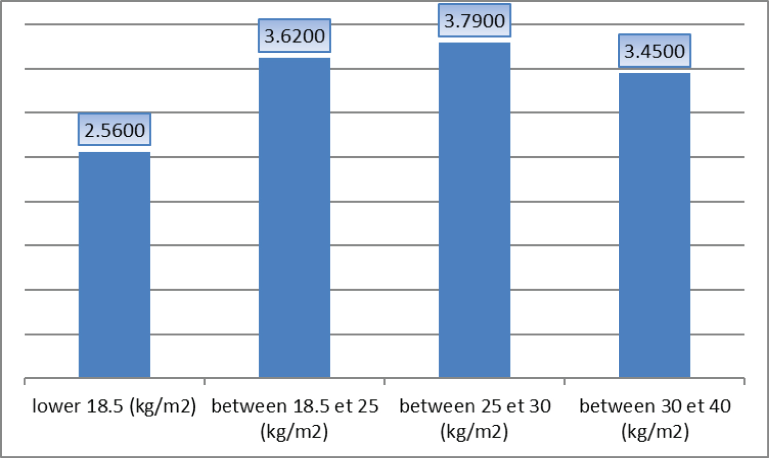 The results obtained in our study show an average BMI of 24.12 4.83 kg/m 2 , with extreme values ranging from 14.60 to 36.90 kg/m 2 . This average is comparable to that observed in the Tunisian cohort studied by Snène [12], where the average BMI was 23.41 4.8 kg/m 2 . Other international studies reported similar or divergent results. For example, El Gazzar AG, et al. [13] in Egypt found an average BMI of 25.32 2.57 kg/m 2 , while Yamada T, et al. [14] in Japan reported a slightly lower average of 22.5 2.9 kg/m 2 . In India, Ramachandran P, et al. [15] reported an average BMI of 20.6 3.5 kg/m 2 , and finally, in Turkey, Topcuoglu C, et al. [16] reported a BMI of 27.05 4.07 kg/m 2 .