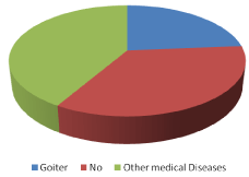 41 (23.7%) cases were had positive family history for goiter, 60 (34.68%) cases had no family history of any chronic diseases, meanwhile the remaining 36 (20.81%) cases had family history of other diseases such as hypertension, DM, Ischemic heart disease, gastric cancer….etc. (Figure 2).