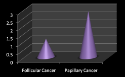 The number of proved malignant cases were 7, among these 5 (71.43%) cases were papillary thyroid cancer and the remaining 2 (28.57%) cases were follicular thyroid cancer, meanwhile among all 173 cases papillary thyroid cancer made up about (2.89%) of operation indications at the time follicular cancer made up about (1.16%) of the indications, Figure 6 and Figure 7 respectively.