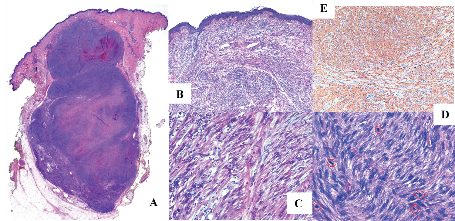 Histological examination revealed a high-grade mesenchymal tumor with a nodular growth pattern and an infiltrative growth pattern up to the upper reticular dermis. It measured 3 × 2 × 2.2 cm. Negative margins, areas of necrosis, eosinophilic cytoplasms, pleomorphic nuclei, severe nuclear atypia and a mitotic index of 20 mitoses per 10 high-power fields, were also described. Immunohistochemical analysis revealed that tumor cells stained positive for actin, h-caldesmon, desmin and CAM 5.2. Immunohistochemical markers were negative for S100, CD117, CD 34, CD 10, p63, MIB-1 Y Phosphohistone-H3. Therefore, the tumor was diagnosed as a primary cutaneous leiomyosarcoma (Figure 1A-Figure 1E).